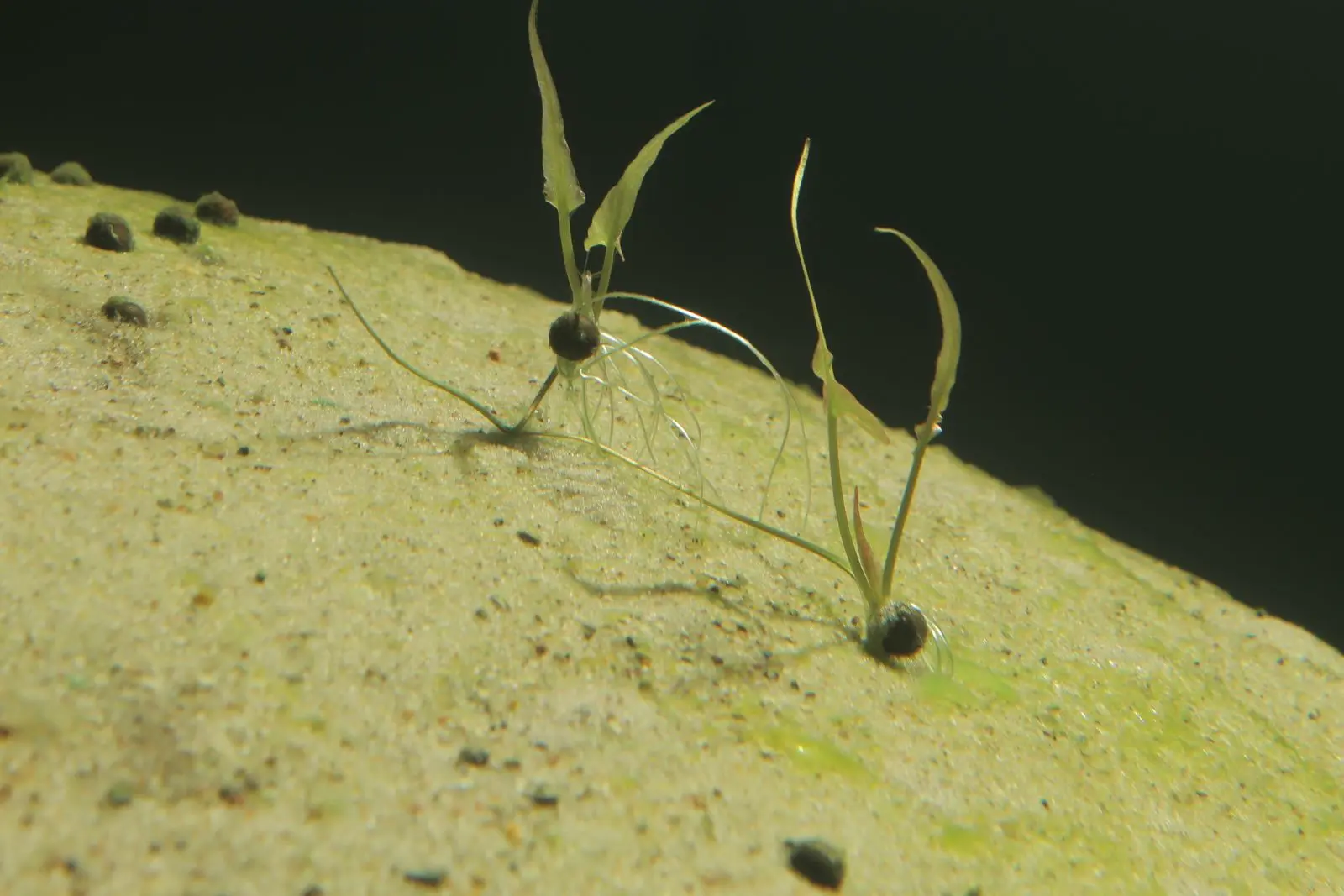 Umgebung (Reflektion des Daches und der Lampen auf der Wasseroberfläche) möglichst unsichtbar zu gestalten. Der Fokus sollte sich allein auf die Pflanze konzentrieren um möglichst alle Details klar herauszustellen. Vorauszuplanen, dass die Sprößlinge im Fokusbereich wachsen, war nahezu unmöglich. Spannend war jeder Besuch am Set, um zu schauen wie die Pflanze gewachsen ist und was im Bild eingefangen wurde.